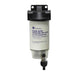 Complete fuel filter and water separating assembly, includes alloy housing with a 10 micron filter element and a see - through clear bowl which is drained via a screw in drain plug. Alloy 1/4" NPT 8mm tails and 1/4" NPT plugs.
