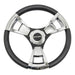 Plastic molded wheel with soft touch rubber grip, chromed/brushed look inserts and genuine aluminum molded in hub (35cm diameter).