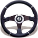 Stylish Italian made 3 spoke U.V. resistant polyurethane steering wheels available in two-toned black/black and black silver comes with 3/4" cast alloy hub. Plastic center cap with medallion included.