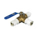 Three way ball valve provides two different flow directions. Housing constructed of brass with plastic System 12 Quick Connect Adapters.